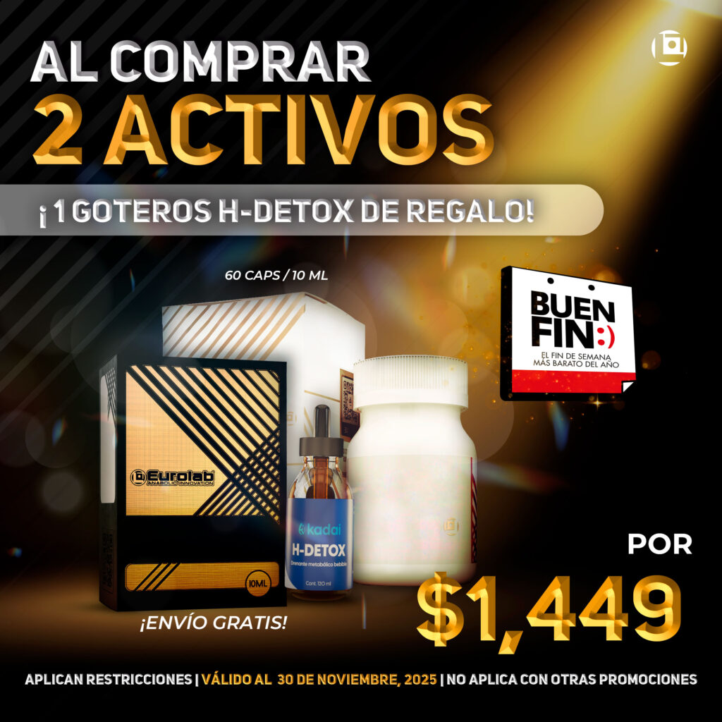Este BUEN FIN, al comprar 2 activos por solo $1,449, recibe 1 gotero H-Detox totalmente GRATIS.